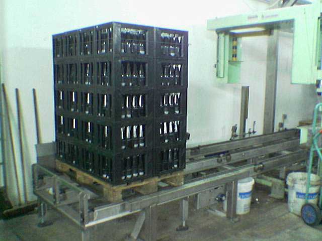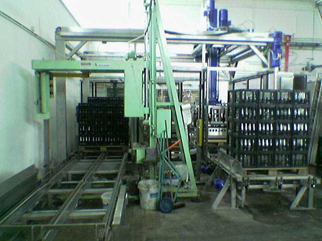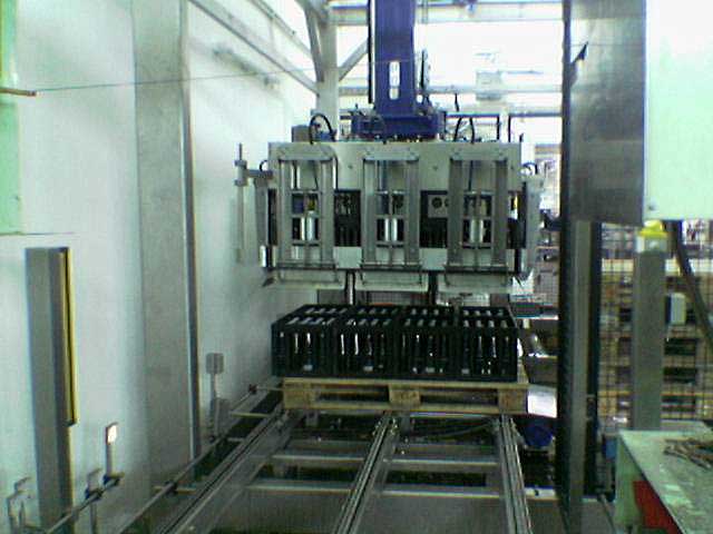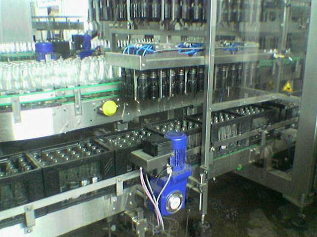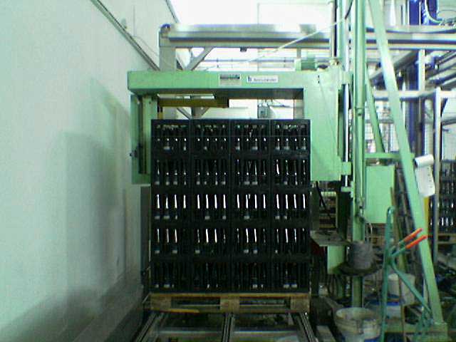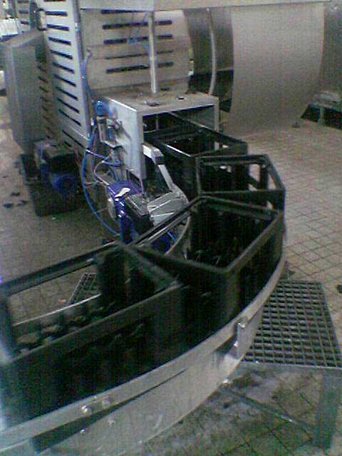 hebt dann immer 48 Stück von oben an und setzt sie in Kisten schräg darunter ein. Ganz vorne rechts sieht man eine eigens nachgerüstete Lichtschranke: Manchmal fallen die ersten Flaschen in der Reihe beim Nachrücken hin und blockieren so Stehplätze - das erkennt dann die Lichtschranke und gibt Alarm, damit in den Kisten keine Flaschen fehlen.