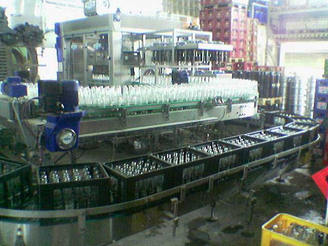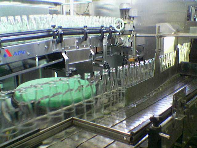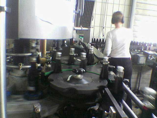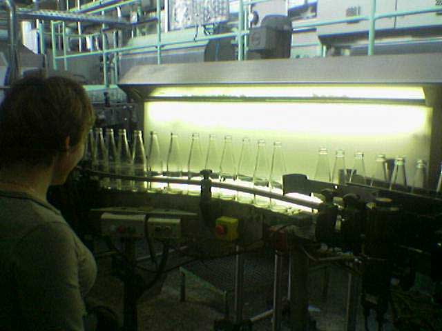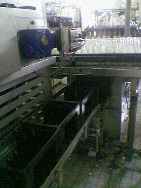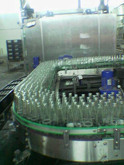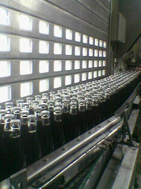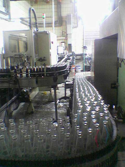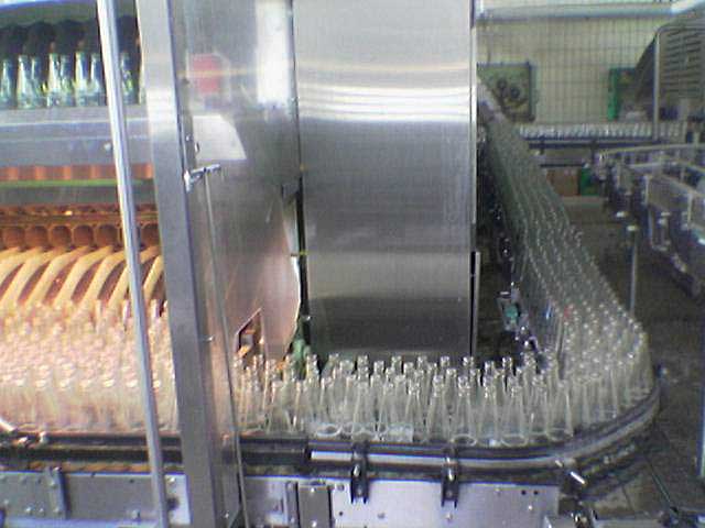 Schräg reinfotografiert - hier werden die Flaschen in gewaschene Kisten eingesetzt: