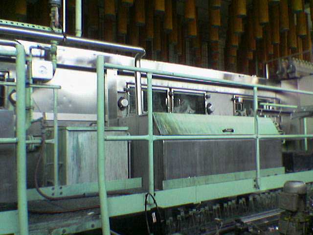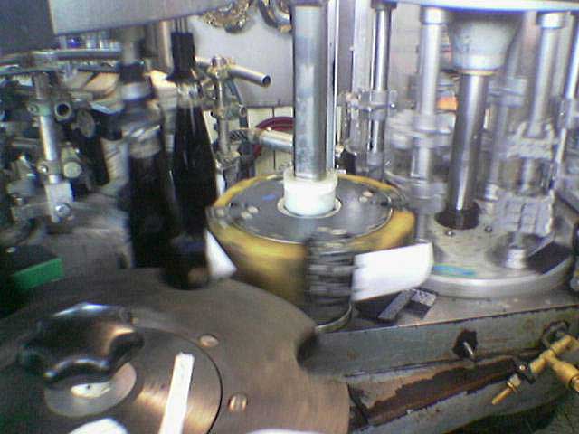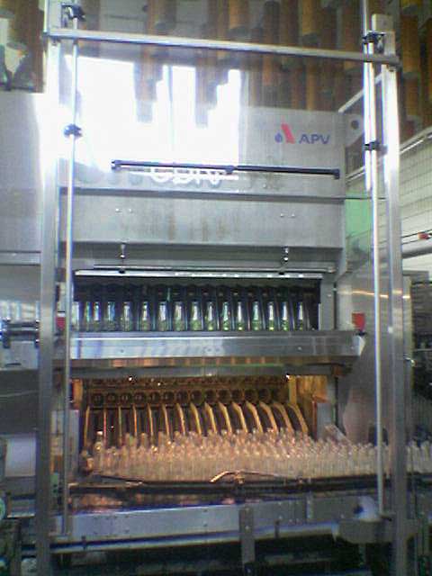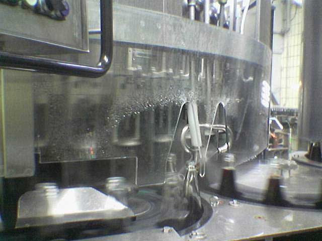 Hier fehlt ein Bild - hinter der Deckelmaschine werden die geschlossenen Flaschen nochmal komplett von oben geduscht, damit keine Spritzer von außen mehr dran sind.