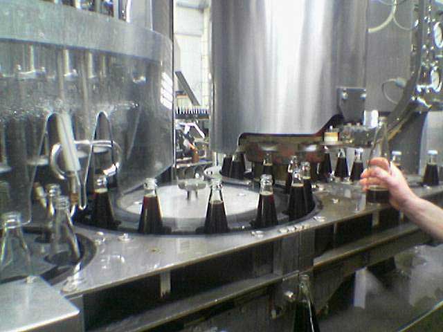 Premium-Cola schäumt relativ stark, deshalb fährt die gesamte Anlage nur auf halber Geschwindigkeit. Trotzdem schäumt sie manchmal noch über - ein Mitarbeiter checkt deshalb die Füllhöhe und trinkt auch mal selbst gern eine, wie man sieht: