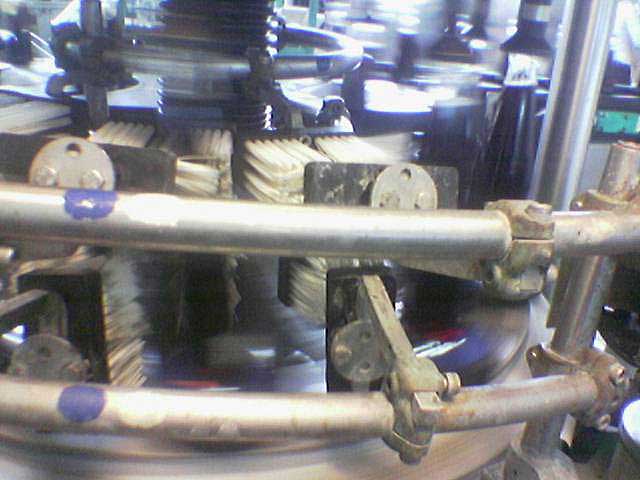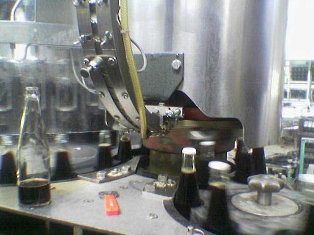 Nun laufen die Flaschen rund um den Füller, ein Drehrad von über 2 Meter Durchmesser, und werden dabei durch Leitungen aus dem oberen Mischraum mit Premium-Cola gefüllt: