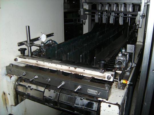 Im oberen Stock dieser Maschine sammeln sich die Flaschen auf vier Zielgeraden. Ein Greifer