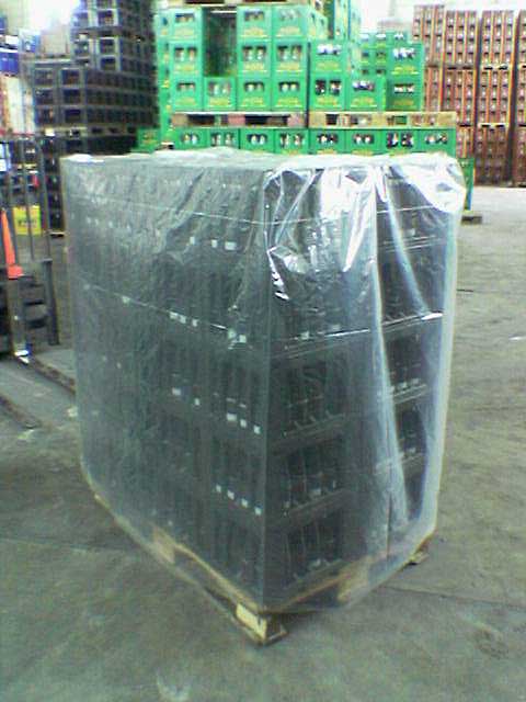 ... ihr seht, weshalb wir immer drauf bestehen dass Leergut sortiert zurückgeben wird ... Der Kistengreifer hebt oben jeweils acht Kisten zugleich ab: