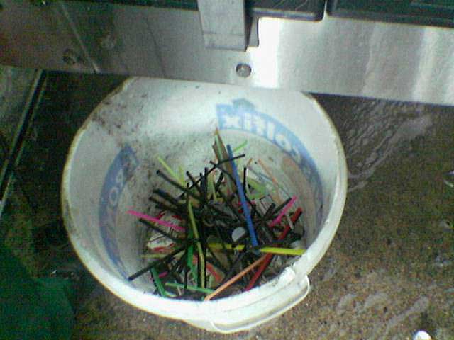 Ein Mitarbeiter sammelt Strohhalme und Müll aus den Flaschen: